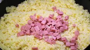 其它材料切成丁。香肠丁(三文鱼丁)。