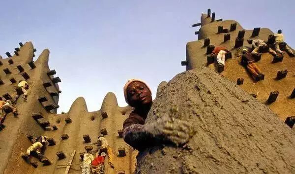 建造在巴尼河边上的Djénné大清真寺是世界上最大的泥砖结构建筑。无论是事实还是传说,其光滑,经过晒干的泥墙和脚手架就像是一座海市蜃楼般出现在中世纪的Djénné,而当时的Djénné正是一个繁荣的贸易枢纽。这座有百年历史的清真寺有着拱形的走廊,密织的房屋和13世纪风格的祈祷室。每年,虔诚的人们会再次集会祭祀,为清真寺涂上新的泥层。纵然会有暴雨将人们的劳动溶蚀,而气候的变化也使河流水位降低,这直接导致了泥浆质量的下降,这为清真寺的“翻新加固”制造了一些困难。还有最近的军事政变和反政府武装的骚乱,可是这一切都只影响了小镇人们的一部分生活。