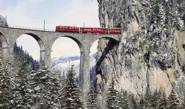 对十九世纪中叶的疯狂探险家来说,瑞士的阿尔卑斯山就是最佳选择,雄伟的山峰,蜿蜒的山谷和从未有人踏足过的净土都能让他们兴奋。经过他们的探险,只有一块地方没有被人类征服——到达那里只有唯一的一条路。但雷蒂亚铁路的阿尔布拉线(1904年通车)和伯尔尼纳线(1910年通车)到达了人类没有到达过的位置。这条铁路由196座高架桥和55条隧道组成,连接了瑞士和意大利的蒂拉诺,其标志性的红色车厢在山脉中非常显眼。