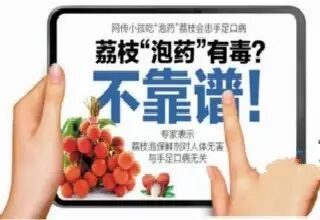 事实真相:手足口病是肠道病毒引起的感染,它和荔枝没有什么关系,也不会通过泡荔枝的“药水”传播。荔枝是一种很难保鲜的水果,用杀菌剂等成分浸泡处理其实是一种合法且必要的处理手段。