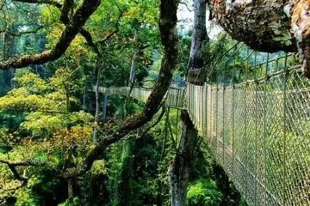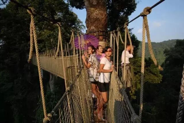 世界上的树冠走廊高度一般都在20米以下,但是云南勐腊县的望天树林区,却架着一座高36米,宽约40厘米,长513米的树冠走廊天桥。经美国生态学家考证,这是当今世界上最高的树冠天桥。