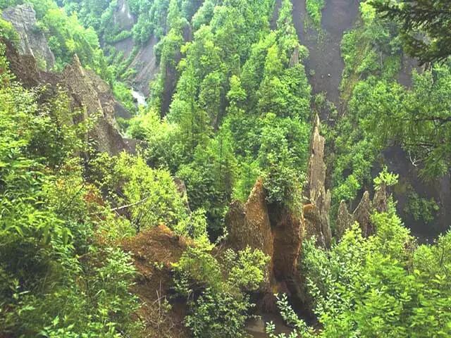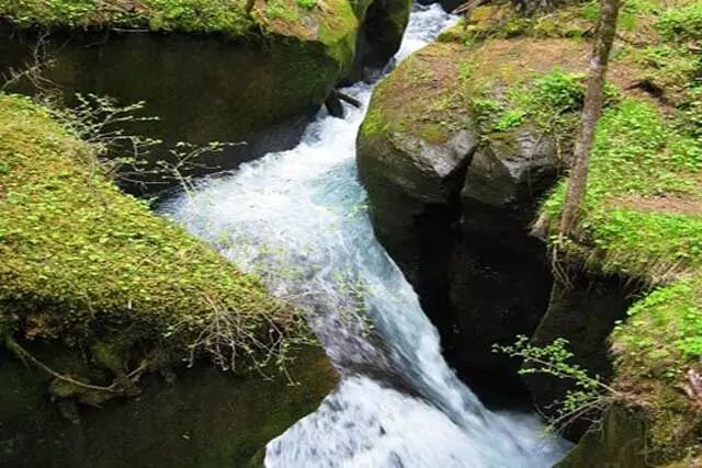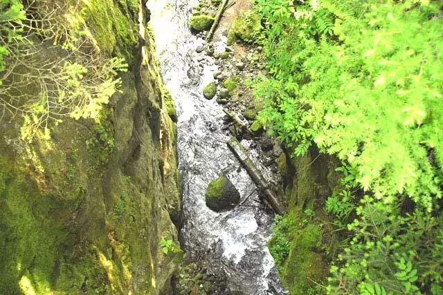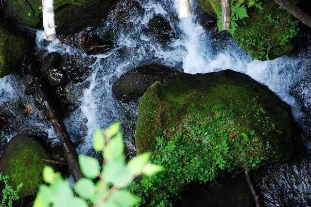 谷底有一条溪流,长约十公里,发源于长白山北锦江,似一只巨大的蟒蛇,不见首尾,闪着银色的鳞卷,蜿蜒而行,消失在迷蒙的远方。峡谷两岸生长着茂密的森林,树木笔直粗壮,由于谷上低温潮湿,使得树木挂满了苔藓,自然、原始之态尤为明显。