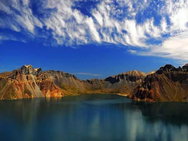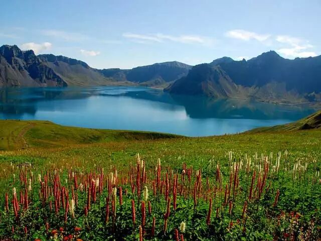 天池湖水清澈碧透,一平如镜;周围16座奇异峻峭的山峰临池耸立,倒映湖中,波光峦影,蔚为壮观。天池上空流云急雾变幻莫测,时而云雾飘逸,细雨蒙蒙;时而云收雾敛,天朗气清,绘出了“水光潋滟晴方好,山色空蒙雨亦奇”的绝妙天池景观。