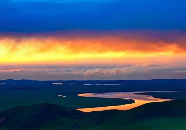 黄河九曲第一湾最美的景色是在日落时分,当夕阳一点点变红朝山边落下去时,整个河谷笼罩在了一片金黄之中,波鳞片片,宛如金色缎带!