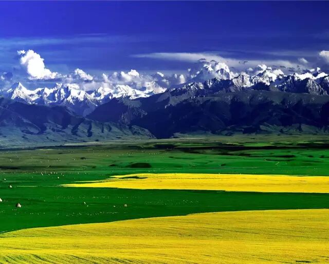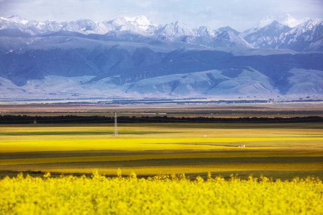 广袤的绿色背景上,大片大片黄灿灿的油菜花、向日葵花镶嵌其中,仿佛天幕上绘就的一幅巨大的油画。这里是全国最大的油菜花田,远处还有连绵的雪山。