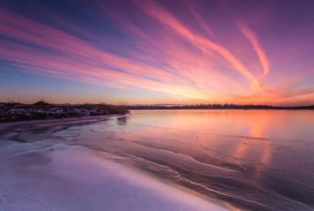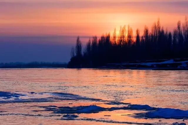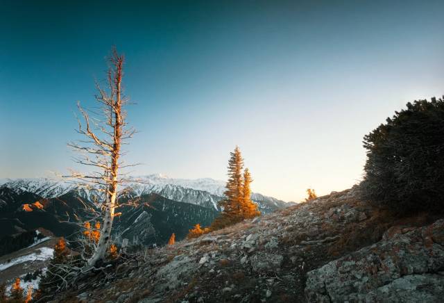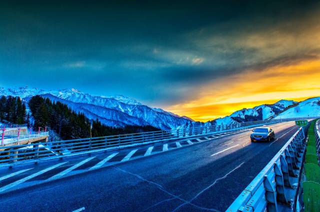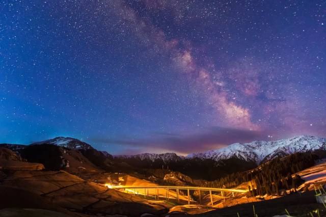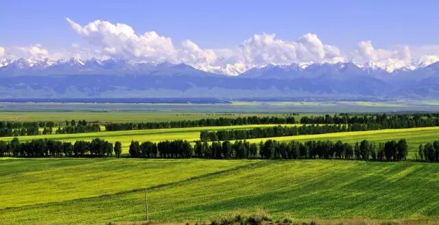 美丽的伊犁河畔雪峰耸立、绿树成荫,是拍摄落日的极佳地点 。