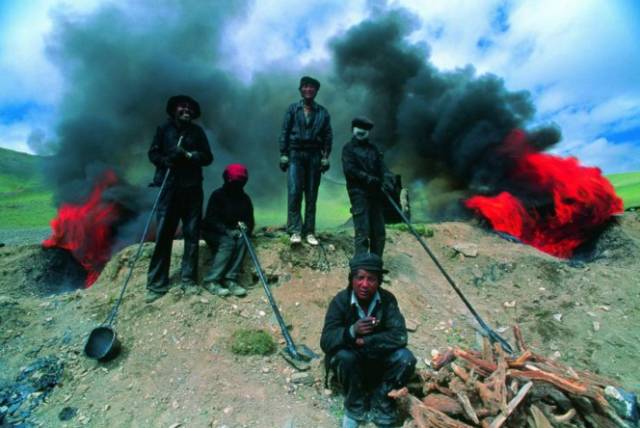 ▲筑路队的工人正在烧制铺路的沥青