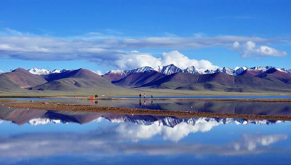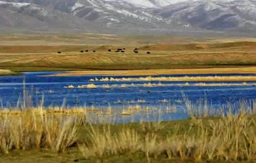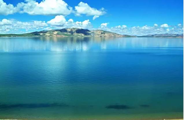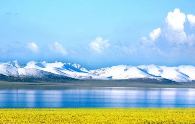 又名"措温布",即藏语"青色的海"之意。镶嵌在青藏高原东北部海拔3000多米的高山原野间 ,远远望去,构成了一幅蓝天、白云、湖光 、山色、草原相映成趣的美丽画卷。