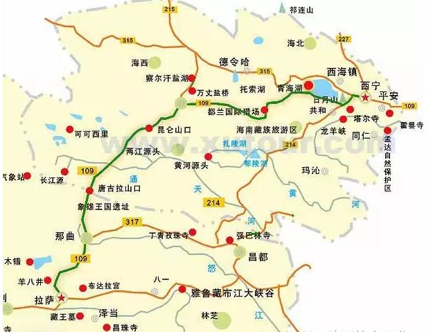 青藏线全程:西宁-(123km)--倒淌河-(196km)--茶卡-(484km)--格尔木-(269km)--五道梁-(150km)--沱沱河沿-(91km)--雁石坪-(100km)--唐古拉山口-(89km)--安多-(138km)--那曲-(164km)--当雄-(75km)--羊八井-(78km)--拉萨。