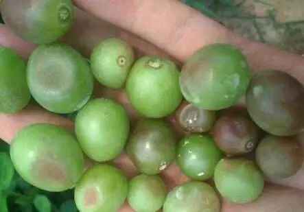 大幼果期葡萄霜霉病侵染,没有霉层,病斑凹陷,这点要区别于日灼跟气灼