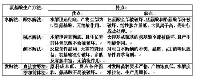 由图中我们看到,各种氨基酸生产方法的优劣,目前农业上应用最广泛的还是酸水解法、酶解法和发酵法。酸解法生产成本低,生产工艺相对简单,大多采用盐酸进行水解处理,生产出的氨基酸中氯离子含量高,不过也可进行脱氯处理。酸水解工艺氨基酸容易被破坏,尤其是植物生长素前体的色氨酸完全被破坏,但也并不是那么不堪,合理得选择和应用也是很不错的。