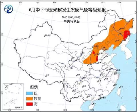 预计6月北方春玉米主产区大部有50~100毫米降水,其中东北地区和内蒙古东部降水量偏多;大部气温接近常年或偏高,气象条件对玉米螟发生发展较为有利。根据玉米螟发生发展气象条件和气象等级预测模型结果综合分析,预计2015年6月中下旬,东北地区大部、河北北部、京津地区、山西大部、陕西中部和甘肃陇东等地玉米螟发生发展气象等级较高,其中吉林东部、黑龙江东南部和山西等地的部分地区玉米螟发生发展气象等级高,玉米螟偏重发生的可能性较大。