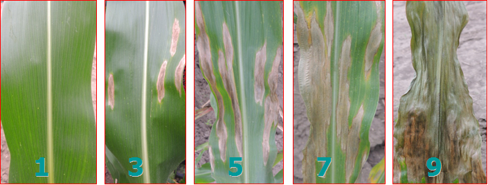 大斑病危害级别:从左到右分别为1级、3级、5级、7级、9级。(中华人民共和国农业行业标准 NY/T1248.1-2006)