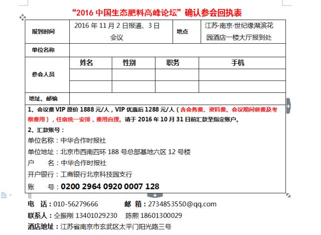 2.本届峰会推出的《2016年度中国生态肥料千人峰会》内刊及《中国农资》报“中国生态好肥料”“中国生态肥料最具影响力人物”全面报道,将作为农资电商运营与投融资重要的手册式读本,纸质印刷版与互联网电子版同步发行,并将充分利用互联网传播手段,向社会推出中国生态肥料全新运营模式。