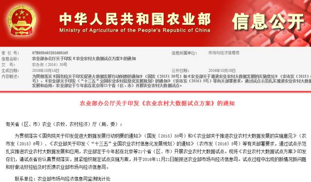 近日,农业部办公厅印发《农业农村大数据试点方案》。农业部将在北京等21个省(区、市)开展农业农村大数据试点,通过试点示范扎实推进农业农村大数据发展和应用。