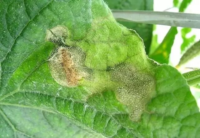 黄瓜灰霉病、蔓枯病这两种病害发病后叶片都表现出大的病斑,病斑直径都在10~35毫米之间,后期病斑中央都会出现裂口,病部都出现灰色霉层和小黑点,病斑都有一定的轮纹,所以很容易判断失误。
