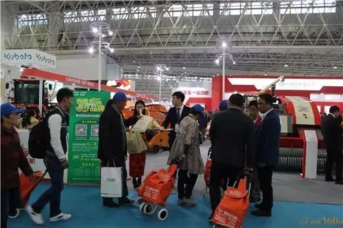 据小编的不完全统计,至少看到10家以上的企业在发购物车,颜色有绿的、红色、蓝的、黄的、紫的,当然让人印象最深的还是农机360网的橘黄色购物车,不仅颜色抢眼,数量也庞大(10000个)。购物车对观众来说是一大福利,把观众双手彻底解放出来,而且购物车带回家还能继续使用很长时间,购物车的袋子还是很好的广告载体,可谓多方受益,多方共赢。小小的购物车上竟蕴含了一个完美的商业模式,难怪得到那么多企业和观众青睐。