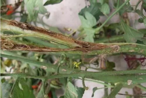 枯萎病初发病时,先是下部叶片枯黄,并大量脱落,与地表接触的茎基部皮层呈水浸状腐烂,地上部茎叶迅速凋萎;有时病部只在茎的一侧发展,形成纵向条状坏死区,后期仍全株枯死。剖检病株地下部根系也呈水浸状软腐,皮层极易剥落,木质部变成暗褐色至煤烟色。在湿度大的条件下,病部常产生白色或蓝绿色的霉状物。西红柿挂果后,植株长势变弱,再加上近期低温、寡照的天气较多,营养消耗大,植株透支严重,枯萎病症状开始显现出来。