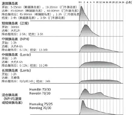胰岛素使用的时间根据其剂型有所不同(图1)。超短效胰岛素(如诺和锐)应餐前即刻注射,短效胰岛素(如诺和灵R)及预混胰岛素(如诺和灵30R)应于餐前30分钟注射,中效胰岛素(如诺和灵N)则应在早、晚餐前30分钟或睡前注射,而长效胰岛素(如甘精胰岛素)则于早或晚固定时间注射。