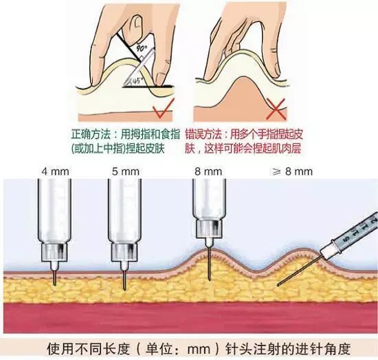 用拇指和食指把皮肤捏起来,45度角快速进针(肥胖者也可垂直腹壁进针),注射完毕以后要在腹部停留6秒钟,以使药液充分吸收,避免药液外渗。