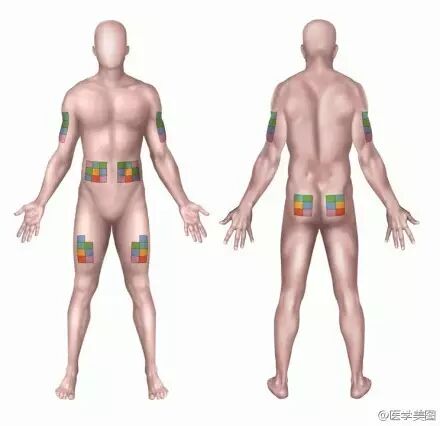 轮换注射部位对于防止脂肪增生或脂肪萎缩是很重要的。按照左右对称轮换的原则,有规律地更换注射部分和区域。两次注射部位需间隔2.5 cm,相当于两个手指的宽度。