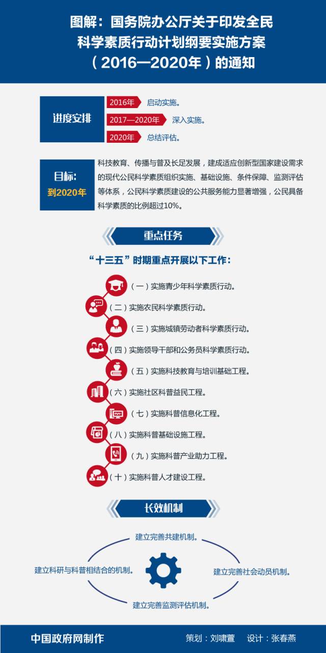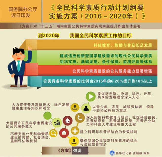时光飞逝,2016年进入了倒计时。今年,国内外科技圈我们一起见证过的大新闻,你都还记得吗? 从11月底开始,我们将会带你依次回顾这一年中的重大科技新闻,并在年底进行投票,由你来选出2016年十大科技新闻~ 为落实好《全民科学素质行动计划纲要(2006-2010--2020年)》(以下简称《纲要》)最后五年的实施工作,中国科协会同中央组织部、中央宣传部、教育部、科技部、发展改革委、财政部、人力资源社会保障部、农业部等部门,共同编制了《全民科学素质行动计划纲要实施方案(2016-2020年)》(以下简称《方案》),经国务院审定由国办印发。 作为全民科学素质行动计划的牵头单位,中国科协的负责人表示,全民科学素质的提高既是一项基础性工程,又是发展的一块短板,目前我国公民科学素质还不能有效支撑创新型国家建设和全面建成小康社会,公民科学素质建设任重而道远,需要加大推进力度。 全民科学素质行动计划纲要五年实施方案公布 中国国务院办公厅近日印发《全民科学素质行动计划纲要实施方案(2016-2020年)》,对“十三五”期间中国公民科学素质实现跨越提升作出总体部署。 这份文件指出,公民科学素质是实施创新驱动发展战略的基础,是国家综合国力的体现。要坚持“政府推动、全民参与、提升素质、促进和谐”的工作方针,围绕“节约能源资源、保护生态环境、保障安全健康、促进创新创造”的工作主题,继承创新、拓展提升,开放协同、普惠共享,精准发力、全面跨越,推动科技教育、传播与普及,扎实推进全民科学素质工作,激发大众创业创新的热情和潜力,为创新驱动发展、夺取全面建成小康社会决胜阶段伟大胜利筑牢公民科学素质基础。 中国官方提出,到2020年中国全民科学素质工作的目标是:科技教育、传播与普及长足发展,建成适应创新型国家建设需求的现代公民科学素质组织实施、基础设施、条件保障、监测评估等体系,公民科学素质建设的公共服务能力显著增强,公民具备科学素质的比例由2015年的6.20%提升到10%以上。 该《方案》强调,要促进创新、协调、绿色、开放、共享的发展理念深入人心,大力宣传普及高新技术、绿色发展、健康生活等知识和观念,以青少年、农民、城镇劳动者、领导干部和公务员为重点,深入实施科技教育与培训、社区科普益民、科普信息化、科普基础设施、科普产业助力和科普人才建设等重大工程,大幅提升公民科学素质建设的公共服务能力,不断完善公民科学素质建设的共建、社会动员、监测评估等机制,建立科研与科普相结合的长效机制,确保中国公民提高科学素质的机会与途径显著增多。 中国官方《方案》要求,各地各有关部门要将公民科学素质建设相关任务纳入工作规划和计划,加大政策支持,加大投入保障,加强督促检查,推动各项工作任务落到实处。 全民科学素质的短板如何补齐? 中国科协负责人表示,上世纪90年代,针对我国公民科学素质与世界发达国家相比差距甚大、严重影响和制约我国经济社会发展的实情,2006年国务院颁布《纲要》至今,我国的全民科学素质行动计划已经实施10年,这是一项延续性工作。 十年来我国公民具备科学素质的比例显著提高。《纲要》颁布以来,开展了大量的科技教育、传播与普及工作,并取得了明显成效。据2015年中国公民科学素质调查,我国公民具备科学素质的比例达到6.20%,比2005年的1.6%提高近三倍。 “科学素质是决定公民的思维方式和行为方式、实现美好生活的前提,是大众创业、万众创新的关键,是实施创新驱动发展战略和全面建成小康社会的群众基础和社会基础。”中国科协负责人表示,但目前我国公民科学素质还不能有效支撑创新型国家建设和全面建成小康社会,如有研究表明,进入创新型国家行列的30多个发达国家,公民具备科学素质别的比例最低都在10%以上,可是目前我国仅为6.2%。 中国科协负责人透露,虽然我国公民科学素质提高很快,但发展不平衡,与世界发达国家相比差距仍然很大,特别是我国公民科学素质公共服务很不均衡,农民、城镇新居民、边远和少数民族地区群众机会明显偏少,随着互联网特别是移动互联网的发展,公众获取科普信息方式发生根本变化,科普还远远不能满足这种需要。 2020年实现公民具备科学素质比例超10% 据中国科协负责人透露,《方案》围绕到2020年建成现代公民科学素质服务体系和实现我国公民具备科学素质的比例超过10%的总目标。围绕经济社会发展新常态的需求,以重点人群科学素质行动带动全民科学素质整体水平跨越提升,同时大幅增强公共服务能力,壮大科普人才队伍,健全公民科学素质建设的长效机制,加强社会动员、监测评估等机制的进一步完善。 围绕上述目标,《方案》提出实施四个重点人群科学素质行动和六大工程。 四个重点人群为青少年、农民、城镇劳动者、领导干部和公务员。六大工程包括:科技教育与培训基础工程、社区科普益民工程、科普信息化工程、科普基础设施工程、科普产业助力工程、科普人才建设工程。 四大措施改善公民科学素质公共服务不均衡现状 谈及我国公民科学素质公共服务不均衡,特别是农民、城镇新居民、边远和少数民族地区群众机会明显偏少的问题,中国科协负责人表示,《方案》按照“普惠共享、精准发力”的方针,强调强化面向这些地区的公民科学素质公