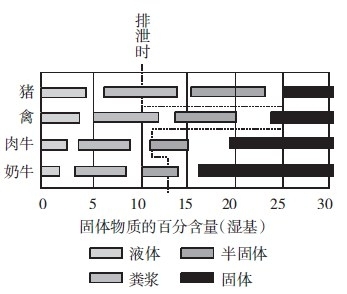 当粪污受到外界环境影响,其中的固体物含量或水分含量发生变化时,可能从一种形态转变成另一种形态,另外动物品种、饲喂日粮、垫草的类型和数量等因素都可能影响粪污的形态。