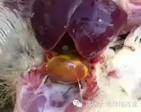 山东阳谷某养殖户817杂鸡12000只。前期鸡群大体正常,轻微过料,16天时突然死亡3、4只鸡/天,期间使用腺胃炎药物和肠炎药物,20天死亡加剧,达100只/天,大群精神不好,采饲稍降,突然死亡。解剖诊断30只,综合解刨现象为:心包积液,为黄色透明,为渗出液,肝脏肿大,发黄,有坏死,出血,肺脏淤血。肾脏条状出血,多混有别的疾病感染而表现为腺胃出血,肠道出血。