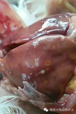 可见喉头出血,心包积液,心脏肿大松软,心肌颁薄,肝脏肿大,苍白,质脆,出现灰白色坏死灶。盲肠扁桃体肿胀,有的肠道淋巴结肿胀突起。部分病鸡肾脏肿大,肺脏充血并出现灰白色渗出物。