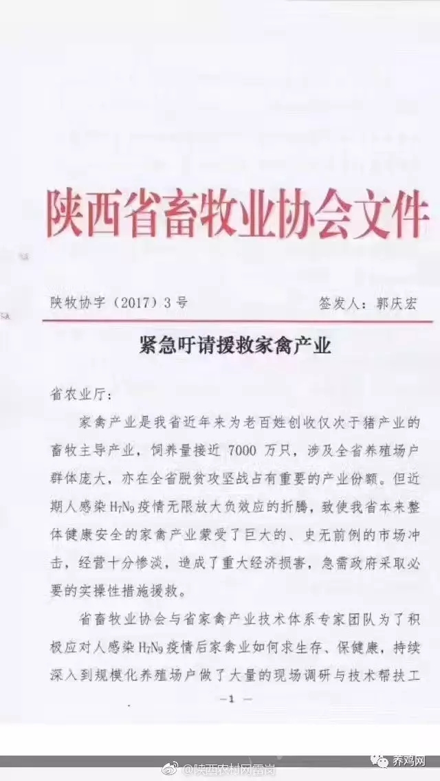 5月19日,陕西省畜牧业协会向陕西省农业厅递交文件,呼吁政府助力重建大众对禽产品的消费信心,并对家禽企业予以资金扶持,援救正值困境中的家禽产业。文件中指出,陕西省家禽饲养量接近7000万只,是当地老百姓创收的主导产业。而近期人感染H7N9疫情带来的负面影响,致使本来健康安全的家禽产业蒙受史无前例的巨大损失。