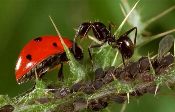 蚜虫多的地方往往还会有蚂蚁。你看到图后可能最先想到的是蚂蚁要吃蚜虫,那就错了。当你继续看下面的文字,你会感到很有趣。