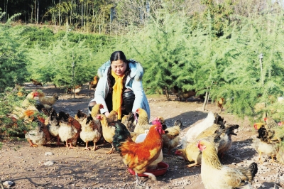 图为王海霞正在喂养土鸡。